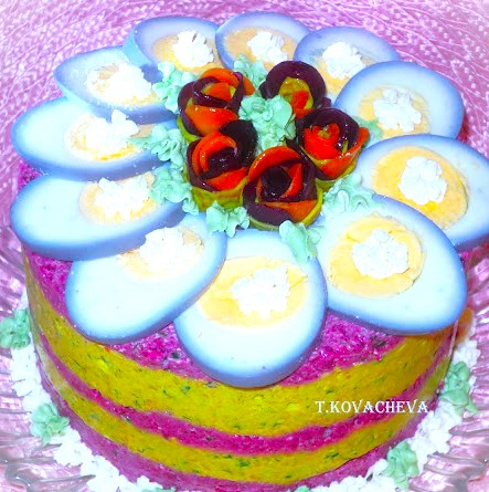 3.Тортена форма се покрива с хартия за печене и в нея се редуват цветните смеси. По средата се нареждат разрязани сварени яйца.