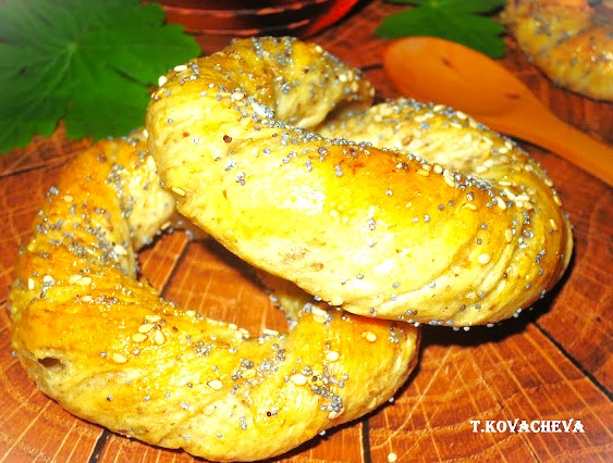 2.Изтеглят се тестени фитили, които леко се усукват и се оформят като гевреци. Те се пускат във вряща подсолена вода и след като изплуват, се изваждат с решетъчна лъжица върху тава с хартия за печене. Намазват се с леко разбит белтък и се поръсват със сусам и макови семена.